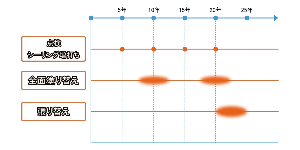 その間も5年おきに点検やシーリング増打ちなどを行うと、良い状態を維持できます。