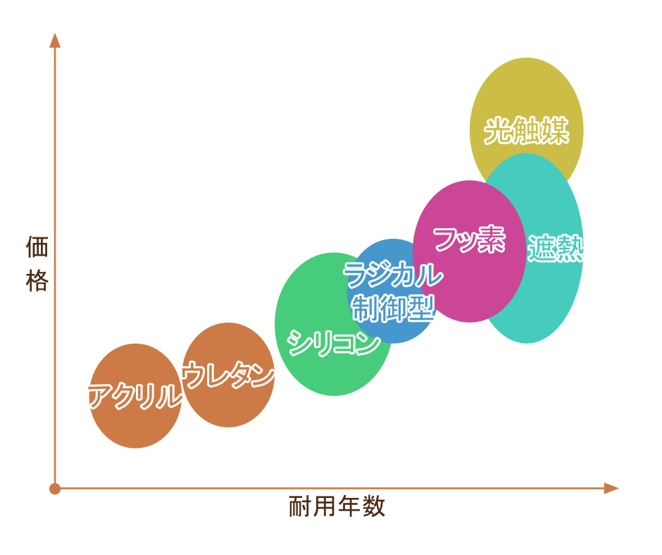 塗料の種類別にみた単価と耐用年数を図にしてみました。