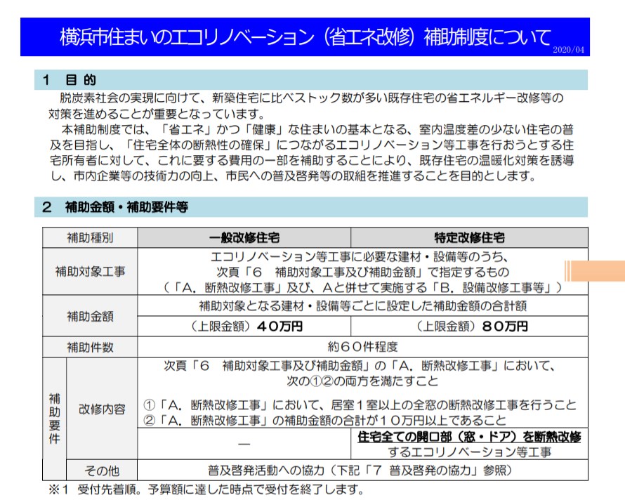 神奈川県横浜市【住まいのエコリノベーション(省エネ改修)補助制度】を例に考えてみましょう。
