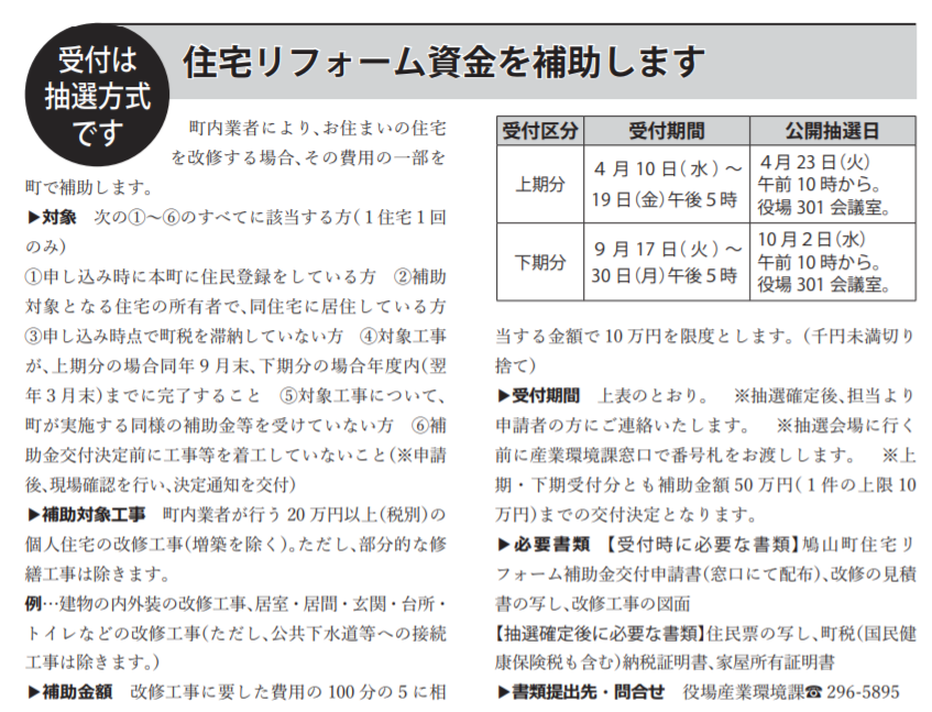 | 事業名 | 鳩山町住宅リフォーム補助金 |